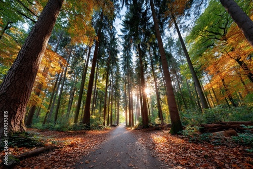 © YouraPechkin, Obraz premium Autumn Forest Path with Golden Sunlight