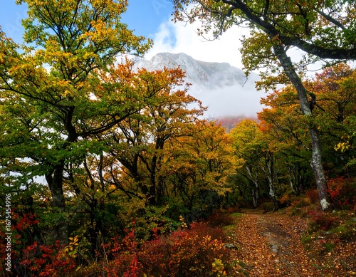 © Kabel, Naklejka premium Autumn forest path with mountain backdrop