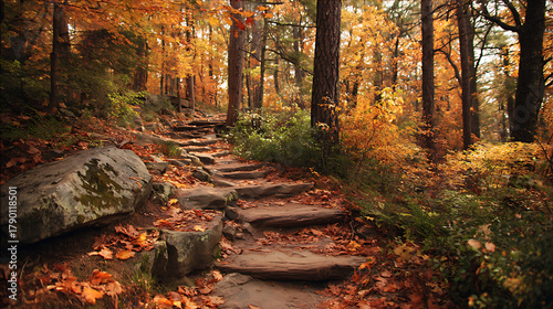 Naklejka premium Autumn forest path with stone steps and fallen leaves image