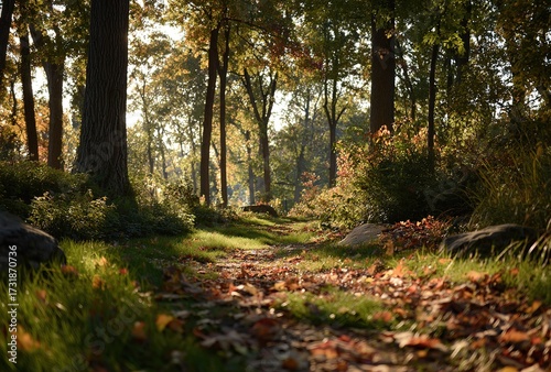 Fototapeta premium Autumn Forest Path with Sunlight: Natural Landscape Material
