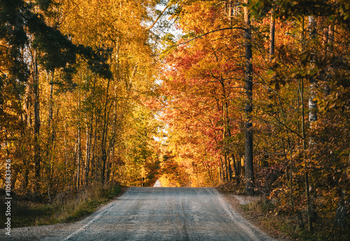 © Aliaksei, Obraz premium Autumn Forest Path with Vibrant Fall Foliage
