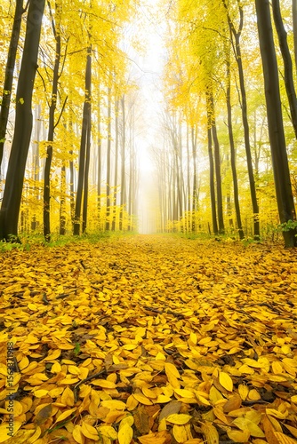 © Infinity Gallery, Obraz premium Autumn forest path with yellow leaves fall foliage and sunlight scenic landscape view