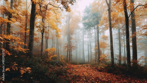 © Marharyta, Obraz premium Autumn forest pathway with vibrant foliage. Artificial intelligence image