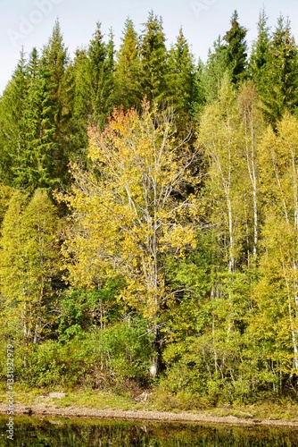 Fototapeta premium Autumn forest reflection in a tranquil lake.