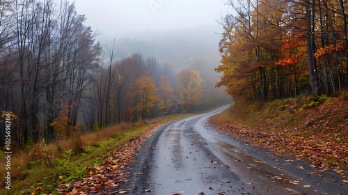 © Alexander, Obraz premium Autumn forest road in morning fog valley