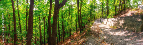 © welcomeinside, Fototapeta premium Autumn forest road panorama. Road through leaves fall wood landscape on autumnal background. Autumn forest nature. Vivid sunshine morning in colorful forest. Scenery of nature with sunlight.