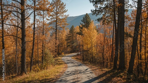 © Lasvu, Fototapeta premium Autumn forest scene with a winding dirt road through trees in fall colors and distant mountains.