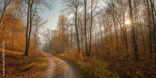 © Kultivad, Obraz premium Autumn forest scene with fallen leaves and bare trees during late November, seasonal change awareness day