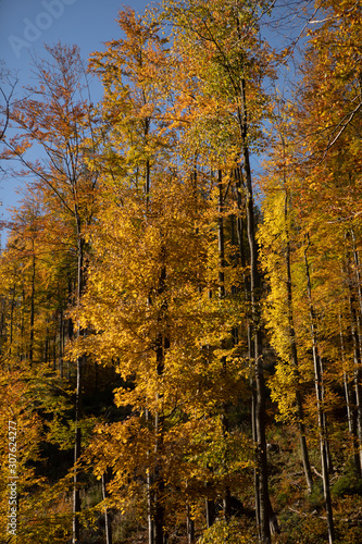 © Lukasz, Fototapeta premium Autumn forest scenery with road of fall leaves.