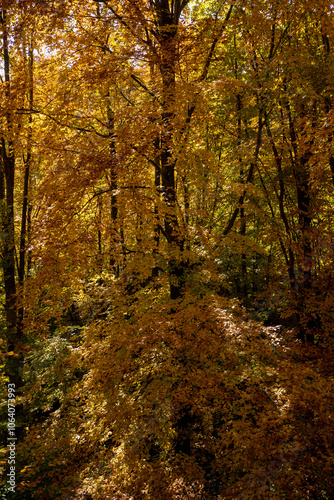 Fototapeta premium Autumn Forest Scenery with Warm Light Illumining the Gold Foliage. Yenice,...