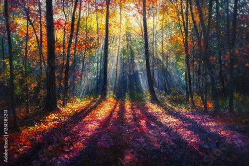 © Gery, Obraz premium Autumn forest sun rays, fall foliage, nature scene, peaceful background, ideal for calendar