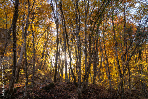 © svetograph, Fototapeta premium Autumn forest sunlight illuminates golden trees in a vibrant natural woods scene