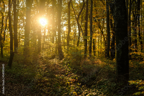 © Stéphane Schorderet, Obraz premium Autumn forest sunset