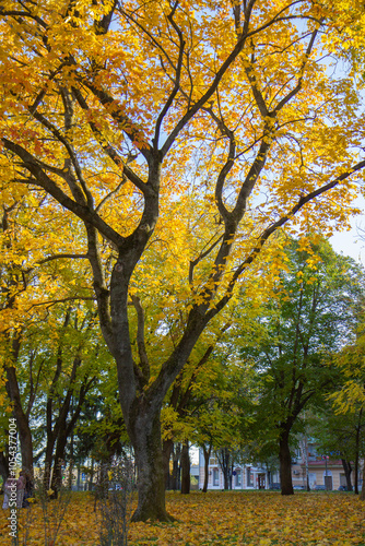 Fototapeta premium autumn forest, tall dreves with yellow foliage