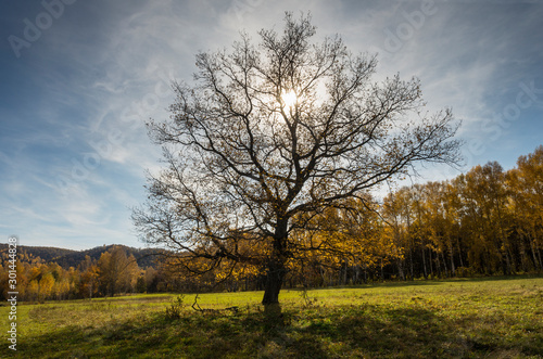 Fototapeta premium Autumn forest. The oak tree in back light.