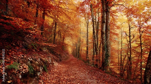 © Asad, Obraz premium Autumn forest trail covered leaves with rich amber and deep red colors