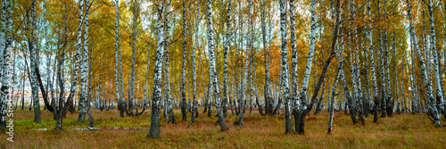 © Алексей Закиров, Fototapeta premium Autumn forest trees sunlight view. Autumn birch tree forest. Autumn birch forest background. Autumn sunlight birch forest view.