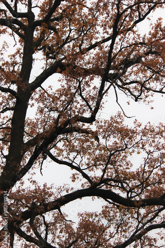 © emerald17, Obraz premium Autumn forest, trees with colorful leaves against sky, cloudy day