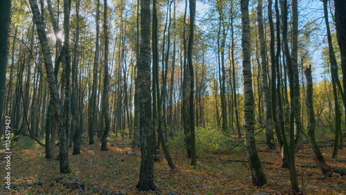 Obraz premium Autumn forest with a sun rays falling on a colorful leaves. Fall nature....