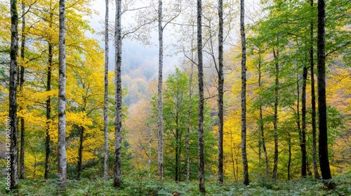 Fototapeta premium Autumn forest with birch trees, misty valley. Possible use Nature backdrop