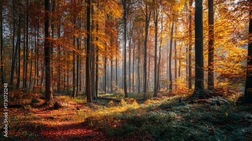 © Irina, Fototapeta premium Autumn forest with colorful fall leaves and amber sunlight