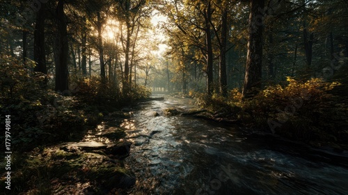 © Shoaib, Fototapeta premium Autumn forest with river flowing, soft sunlight, cinematic 8k realism