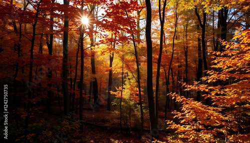 © hwsky, Fototapeta premium Autumn Forest with Sunlight Streaming Through Trees