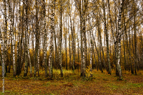 © Eugene_Photo, Fototapeta premium Autumn forest with tall birch tree trunks and fallen yellow leaves on the ground. Natural seasonal scenery, nature background.