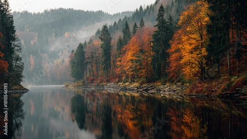 Fototapeta premium Autumn forest with vibrant orange and yellow foliage along the calm lake...