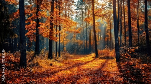 Fototapeta premium Autumn Forest with Vibrant Orange Leaves and Sunlight Through Trees in a...