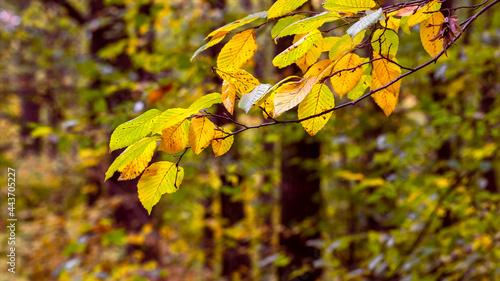 Obraz premium Autumn forest with yellow and green leaves on the trees