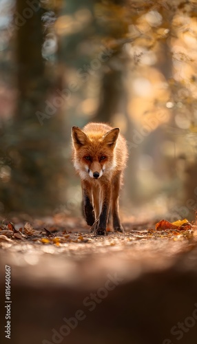 © decorator, Naklejka premium Autumn fox strolls through sunlit forest a serene wildlife portrait of gentle beauty and peaceful nature scenes