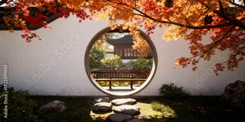 © duyina1990, Fototapeta premium Autumn Garden View Through Circular Moon Gate