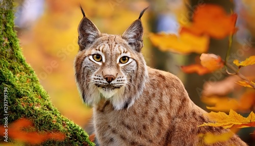 Obraz premium Autumn Glow Ignites an Enchanting Gaze of a Cute Eurasian Lynx Among Ablaze...