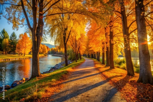 Fototapeta premium Autumn Glow Riverside Park Whitefish Montana Candid Photography Path Fall...