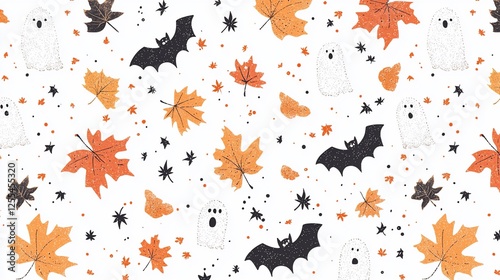 Fototapeta premium Autumn Halloween pattern ghosts, bats, leaves. Website background