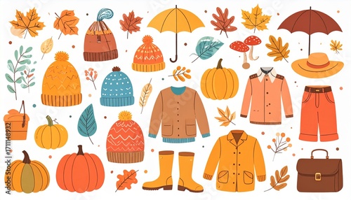 Fototapeta premium Autumn harvest and fall favorites elements set. Thanksgiving basket and...