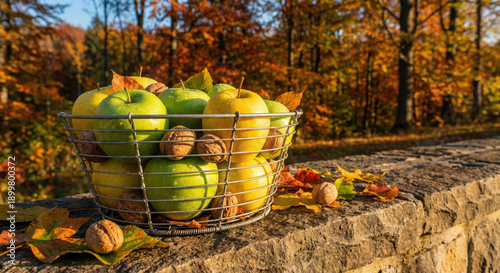 © Babla, Fototapeta premium Autumn Harvest Basket of Apples and Walnuts on Stone Wall stock