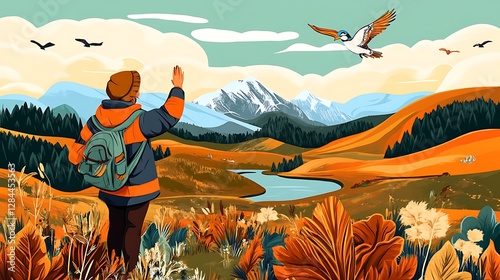 Obraz premium Autumn Hike: Digital Illustration of a Person Greeting a Bird Over a Mountain...