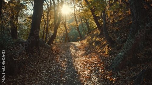 © Rizvan, Fototapeta premium Autumn hiking trail in Alpine forest with vibrant leaves and sunlight filtering through the trees creating a serene outdoor atmosphere