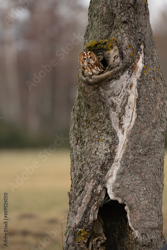 © Jaroslav, Obraz premium Autumn in nature with an Tawny owl (Strix aluco) sits on a tree trunk apple tree on a nest hole. Portrait of a owl in the nature habitat.