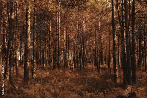Obraz premium autumn in the coniferous forest landscape, abstract view of the autumn yellow forest, beautiful nature