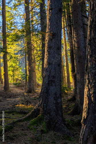 Naklejka premium Autumn in the forest light hitting the tree bark