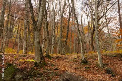 © Loucine, Fototapeta premium Autumn in the woods with lots if leaves and trees.