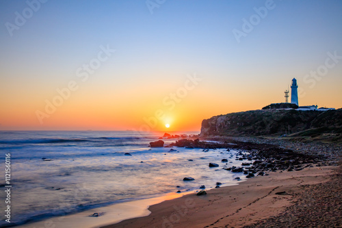 © M・H, Fototapeta premium 秋の犬吠埼灯台と日本一早い日の出 千葉県銚子市 Autumn Inubosaki Lighthouse and the earliest sunrise in Japan. Chiba Pref, Choshi City.