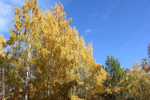 © ka8terina, Fototapeta premium Autumn kroner of birches against the blue sky.