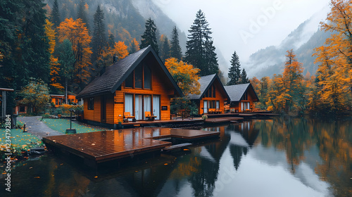 © BROPRADANA, Fototapeta premium Autumn lake cabins, mountain view, misty day, travel