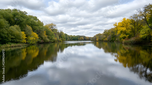 © Munanto, Fototapeta premium Autumn Lake Reflection: Serene Landscape with Yellow and Green Trees