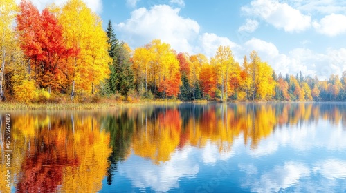 Fototapeta premium Autumn lake reflection, vibrant foliage, serene landscape, idyllic fall...