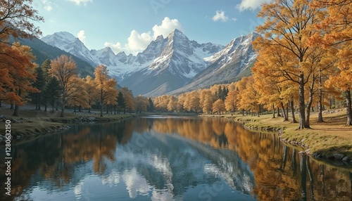 © Elen, Obraz premium Autumn lake with golden trees and snow-capped mountains